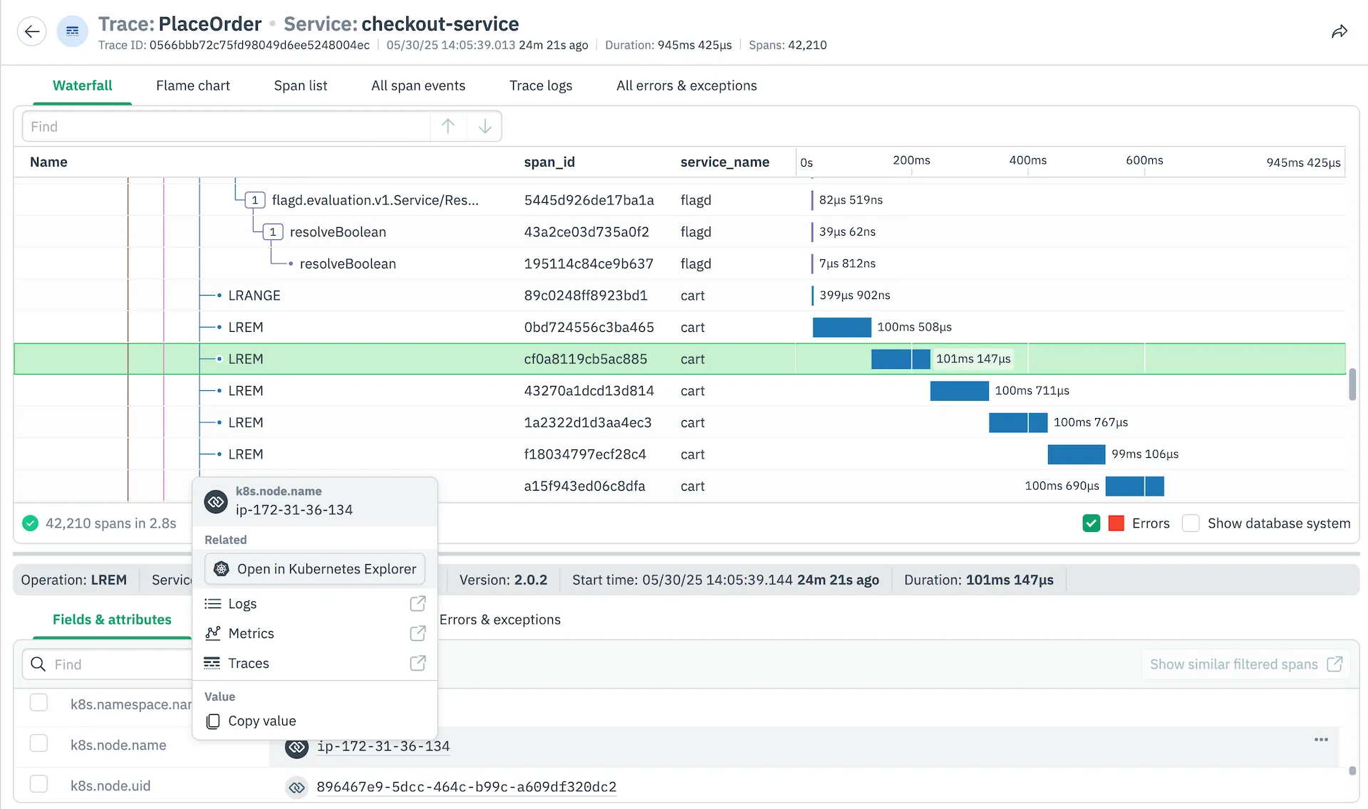 Pivot seamlessly from traces to logs, metrics, and infrastructure data without the manual "stitching" that wastes hours during incidents.