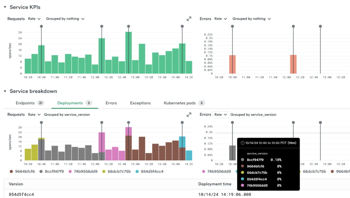 Compare RED metrics across concurrent deployment versions, including canary releases, to quickly identify performance regressions in real-time.