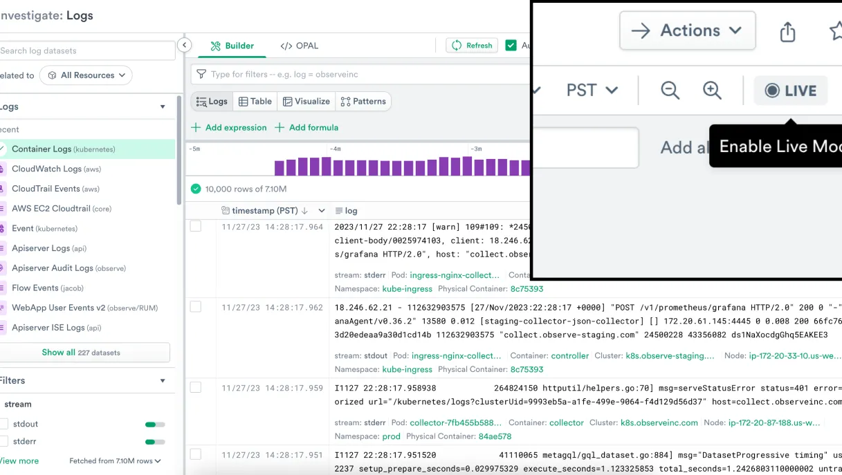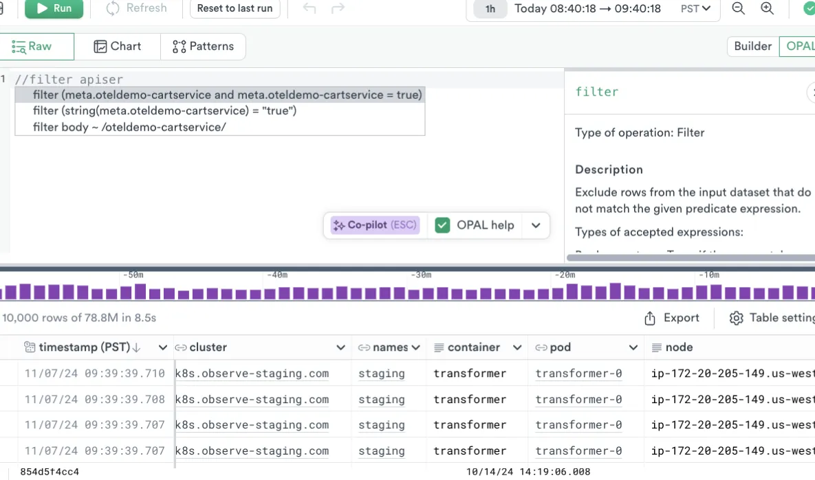 Explore log data using Query Builder or OPAL, a feature-rich query language to explore and transform data. Use O11y Copilot to generate OPAL.