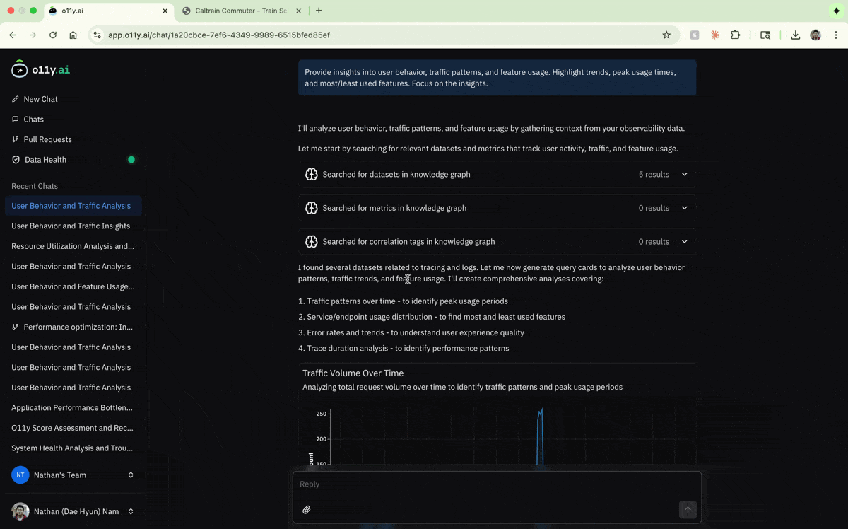 With observability data flowing, interact with it using a chat interface within o11y.ai. Common starting questions include: