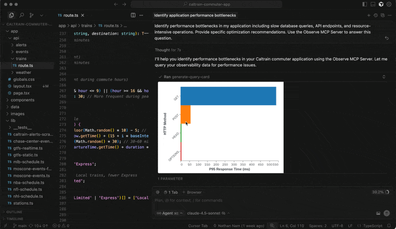 Organizations needing extensibility can create customized agentic workflows using the Observe MCP Server, which leverages Observe’s knowledge graph to provide AI agents more context on observability data for greater accuracy. You can create custom agents, which bring in proprietary data and other business context, to meet your unique enterprise requirements. You can also connect agentic tools, such as Cursor, Claude, and Augment, to explore your telemetry from those environments.