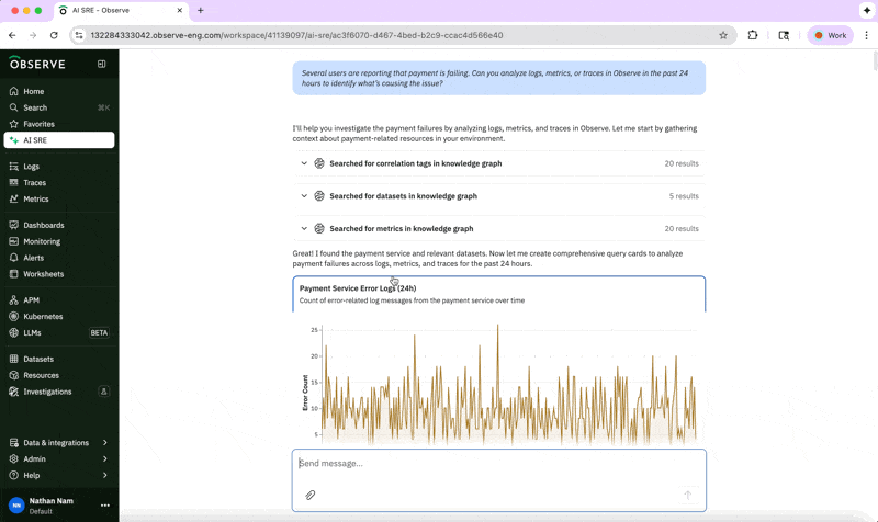 “Several users are reporting that payment is failing. Can you analyze logs, metrics, or traces in Observe in the past 24 hours to identify what’s causing the issue?”