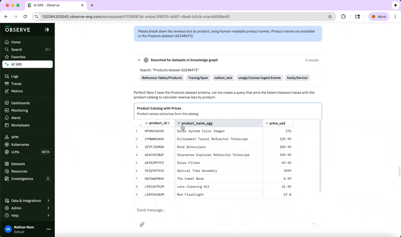 By operating directly within the Observe platform, the AI SRE eliminates the overhead of duplicating data, data egress, and expensive cross-platform joins. This avoids the hidden tax of layering AI on top of fragmented observability tools and ensures you are not trading AI efficiency gains for AI cost sprawl.