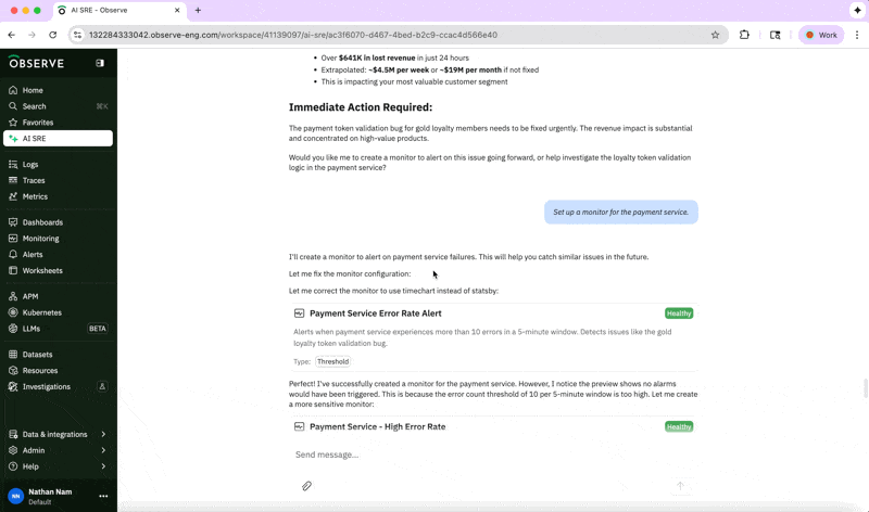 Let’s walk through how users may interact with the AI SRE from the perspective of an on-call engineer troubleshooting an issue with a payment service.